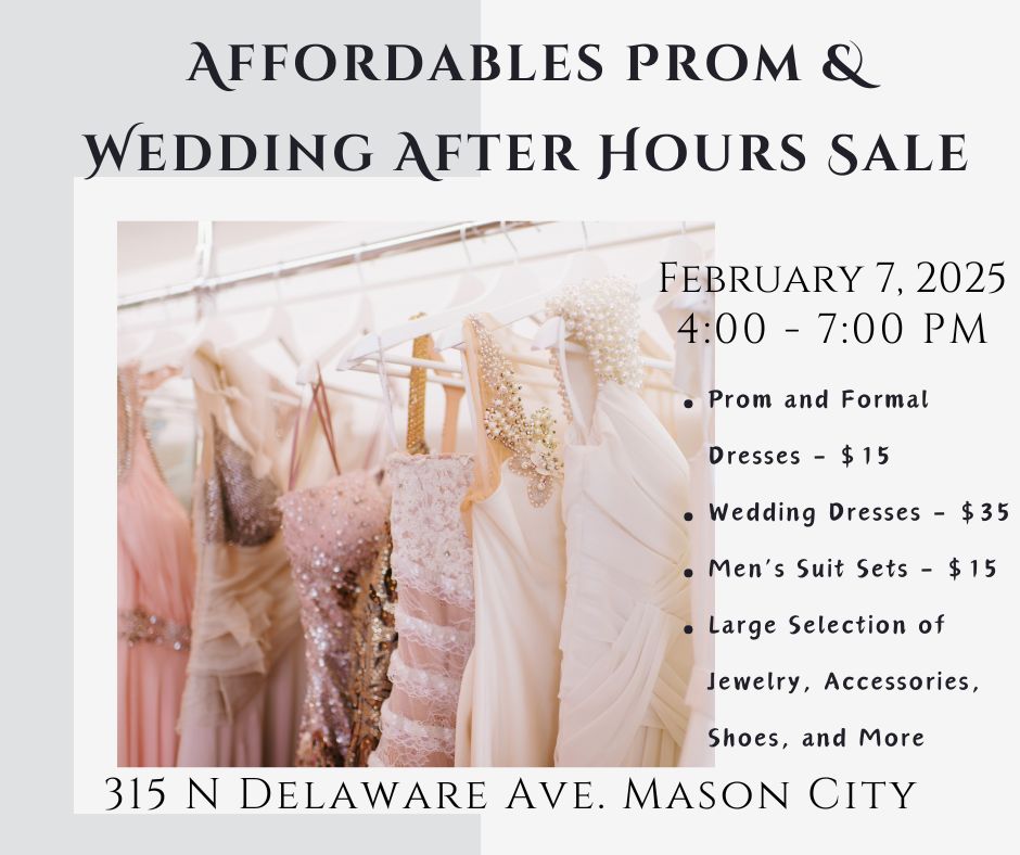 Affordables Thrift Store 315 N Delaware Ave, Mason City, IAAffordables Prom & After Hours Sale 🎉 Get Ready for the Big Day Without Breaking the Bank! Join us on February 7, 2024, from 4 PM - 7 PM at Affordables Thrift Store for unbeatable deals on everything you need to look your best: 💃 Prom & Formal Dresses – Only $15 👰 Wedding Dresses […]